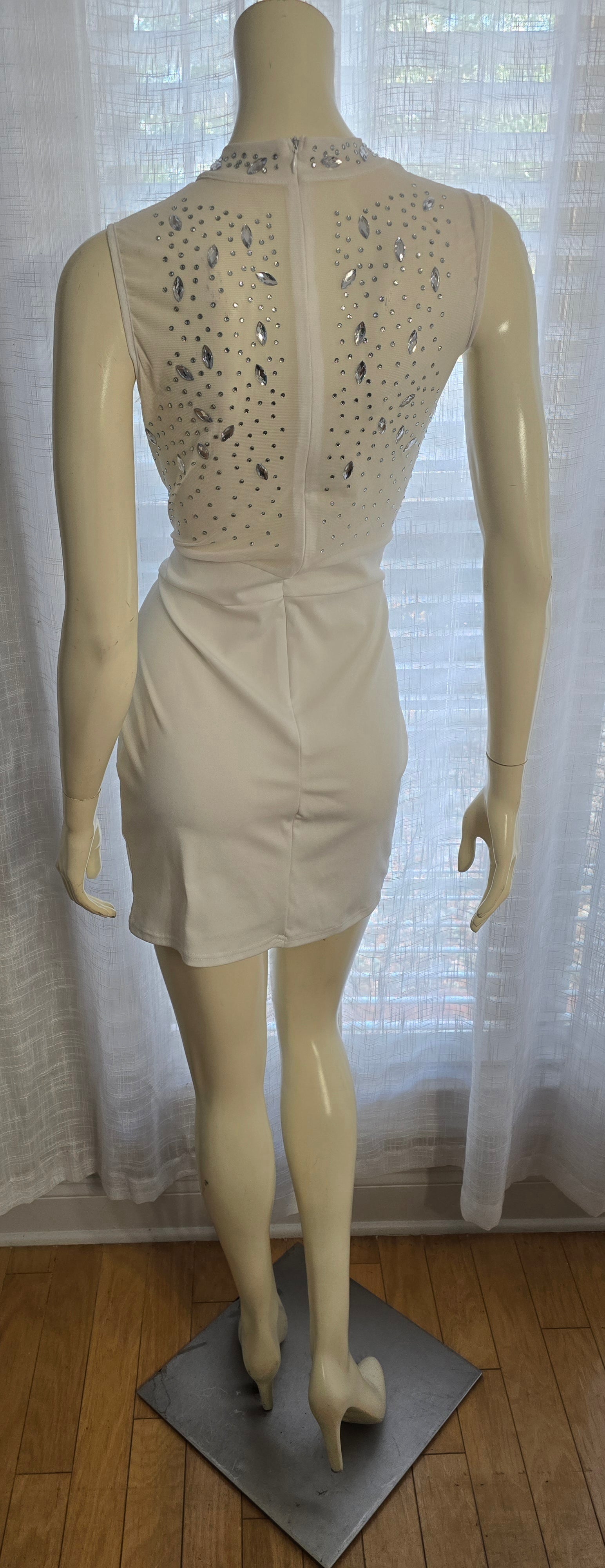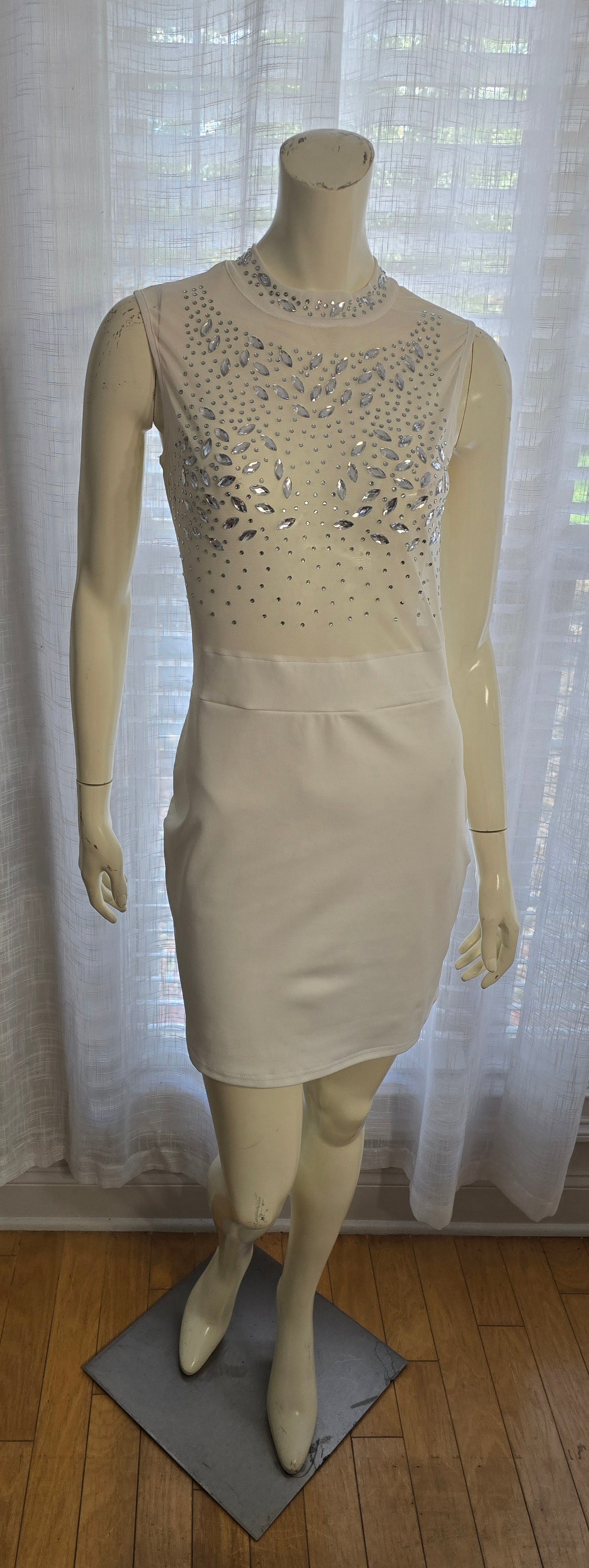 Be bold in this NWOT White Embellished Fitted Dress Sz L! The top half is daringly see-thru with stunning embellishments, while the back features a zipper for a perfect fit. Made of stretchy polyester and spandex, it's perfect for stepping out and standing out.