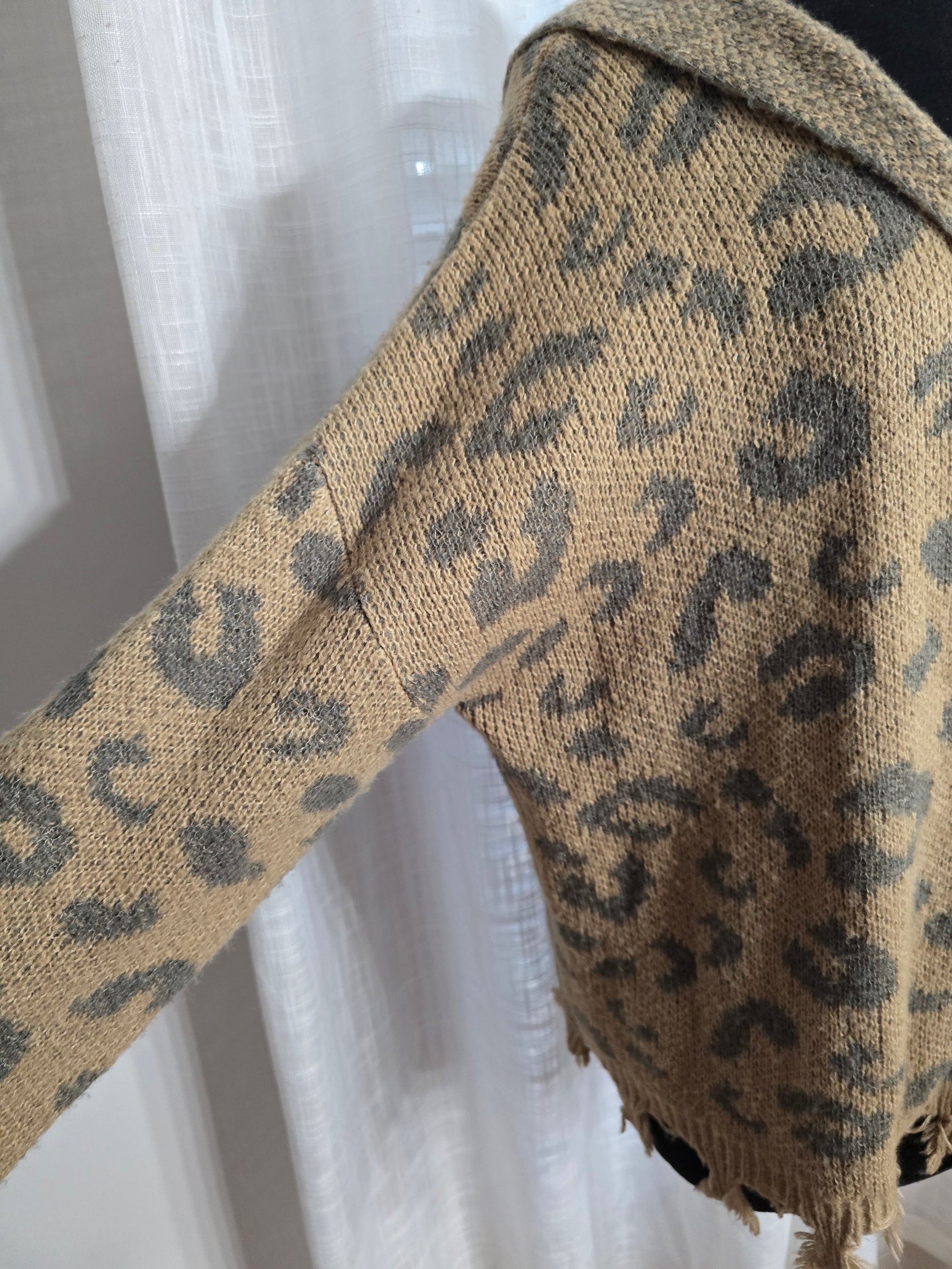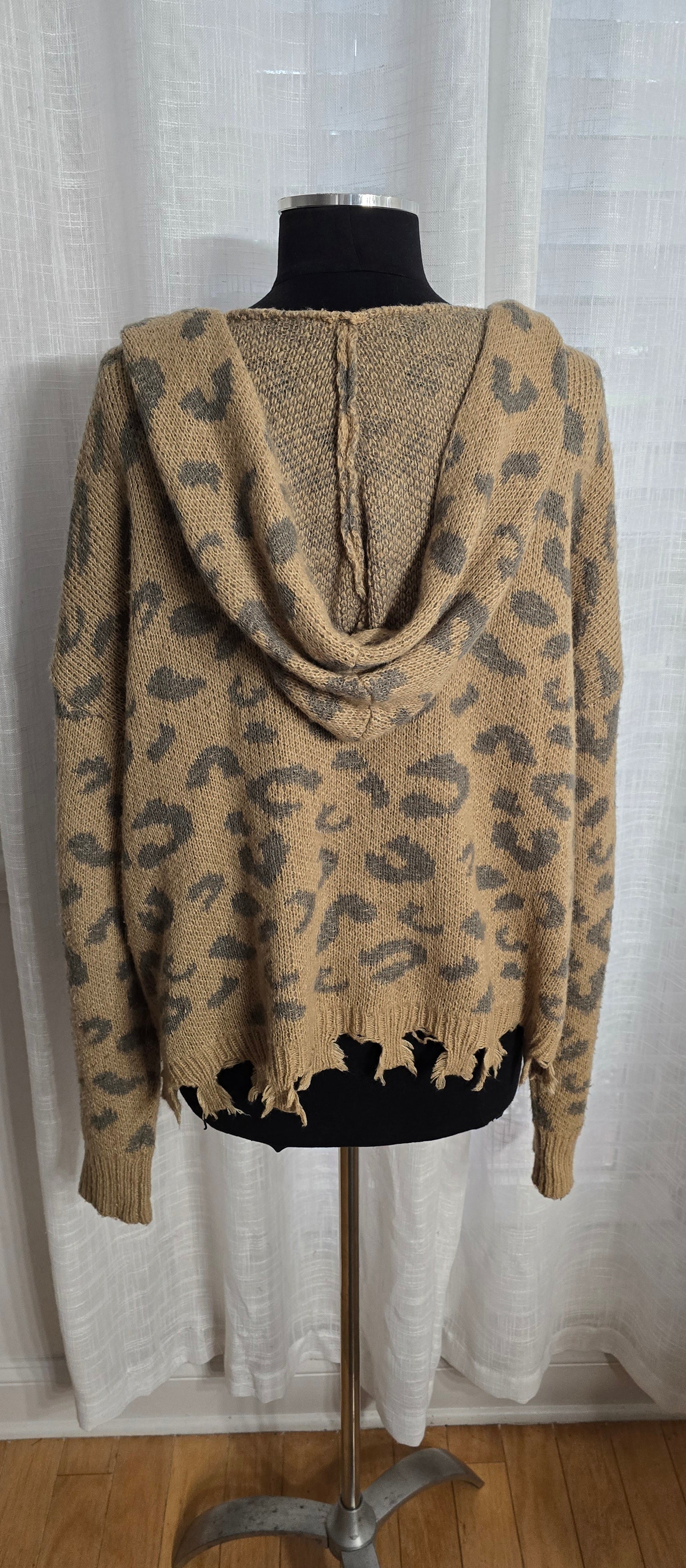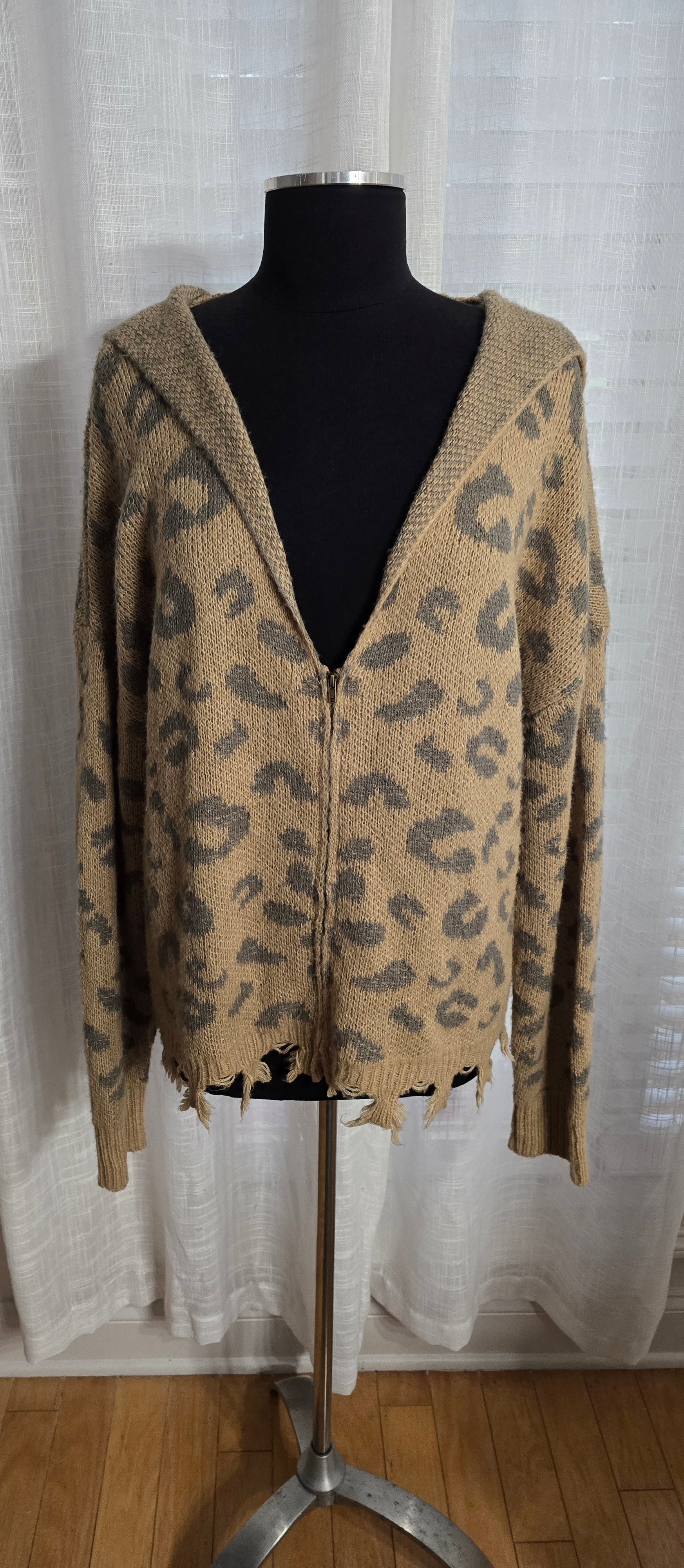 Stay cozy and stylish with our Willow Root Animal Print Hooded Cardigan. Made with stretch fabric for ultimate comfort, this cardigan also features a zipper closure for convenience. Perfect for snuggling up on chilly days. Size L. Has frayed hem.
