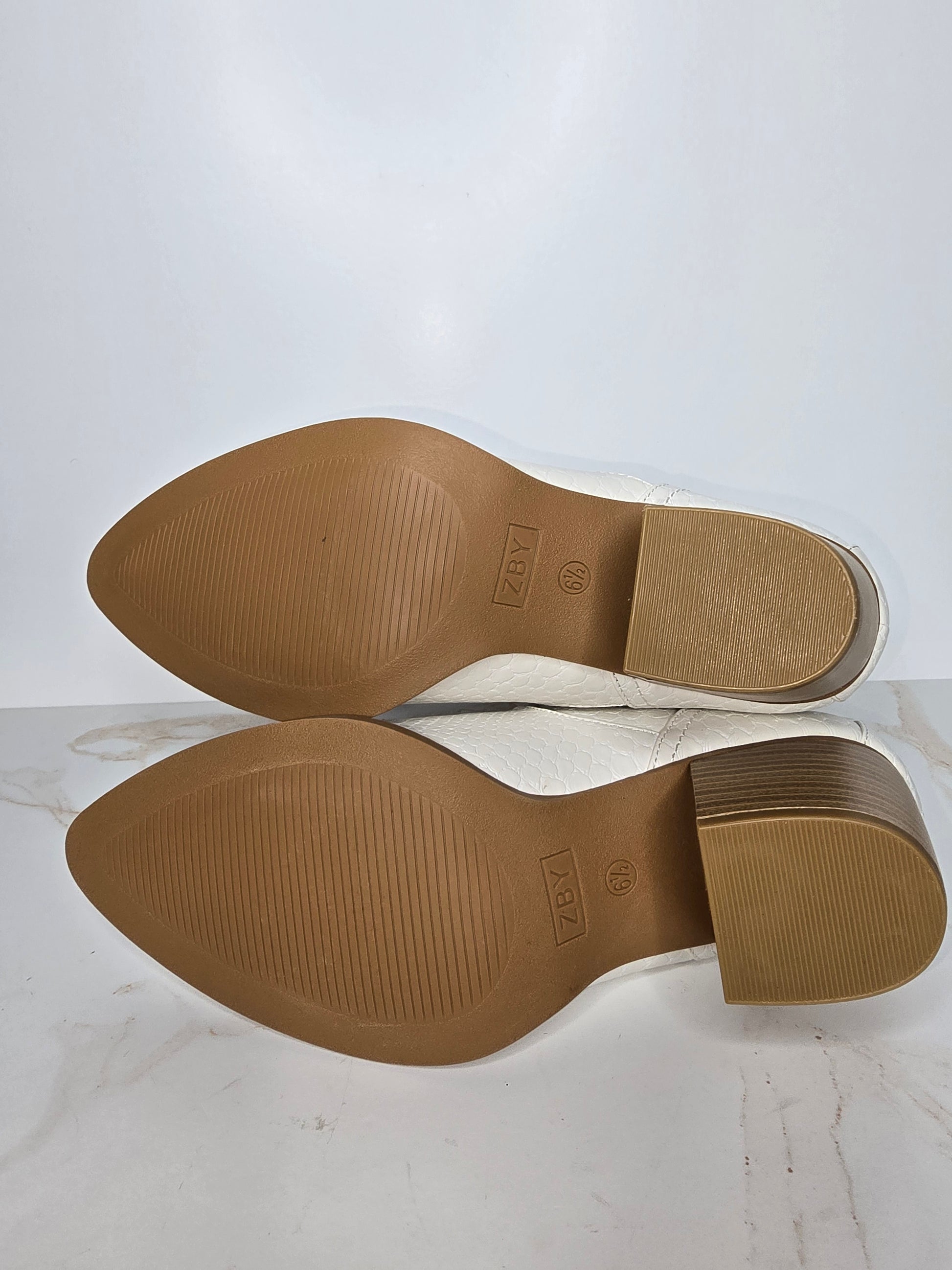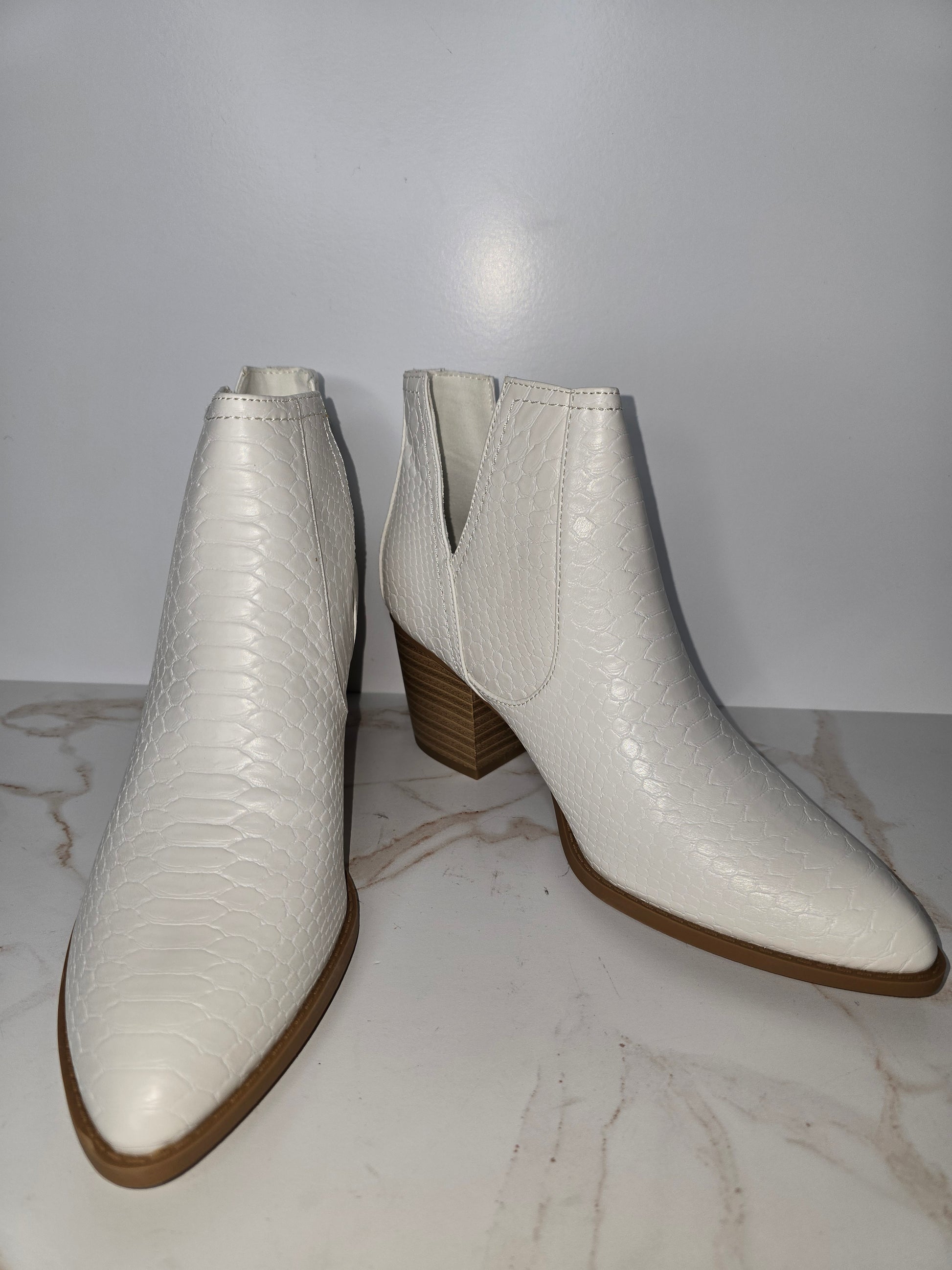 Step out in style with our ZBY Winter White Faux Snake Ankle Boot. With a Western-inspired design and a comfortable 2.5" block heel, these boots will elevate your look while providing all-day support. Perfect for any occasion. New.