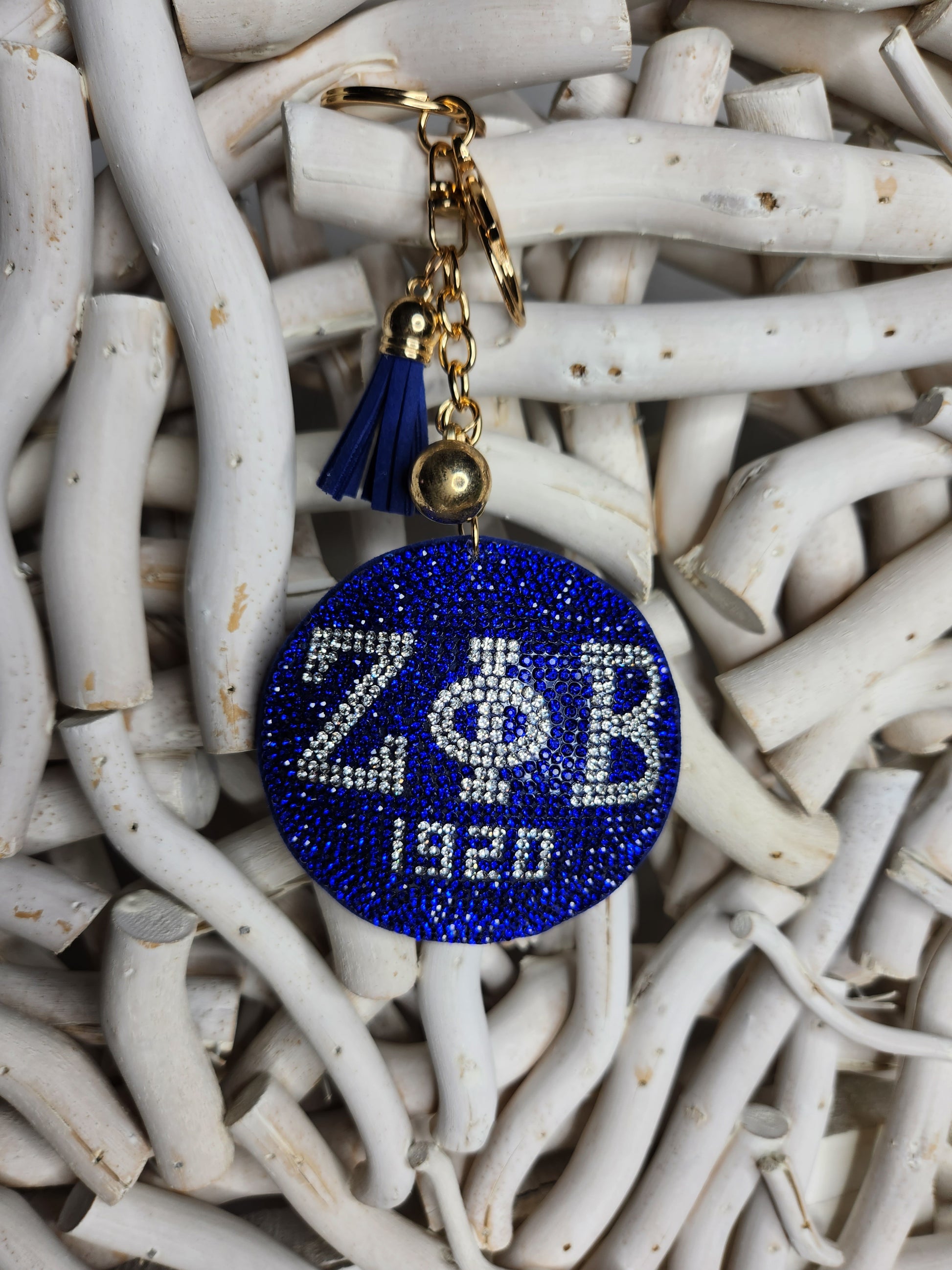 Show your sorority pride with our Zeta Phi BetaRho keychain. Always be able to find your keys with this shimmery royal blue keychain with lobster clasp, tassel, and keyring. The perfect gift or buy it for yourself.